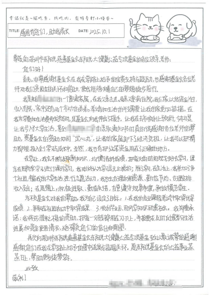 一名学子在信中透露:父亲去世后,母亲因重病住院,全家依靠低保金生活。“家中还有两个年幼的弟弟,教育和生活的开支让我的家更加拮据。在我为学费和生活费而发愁时,是基金会向我伸出了援手。”在他看来,东阳光基金会的资助如同“定心丸”,帮助家庭卸下了经济负担,让他可以把精力投入到学习与成长中。这是真正的雪中送炭。